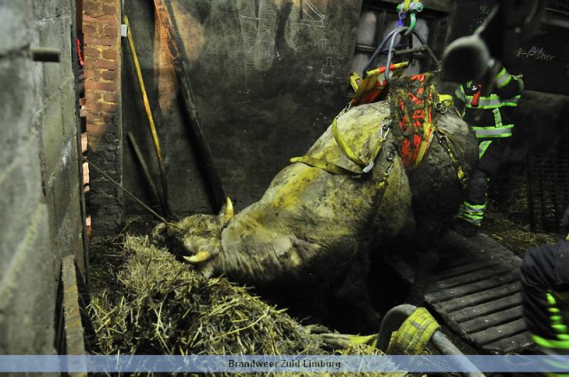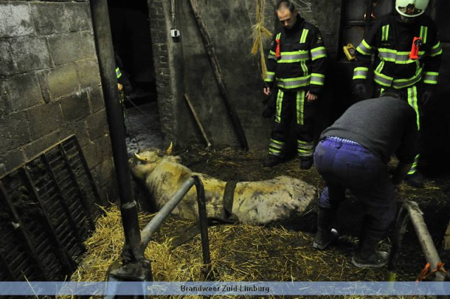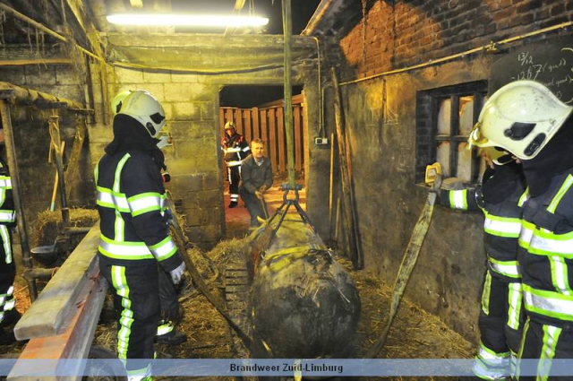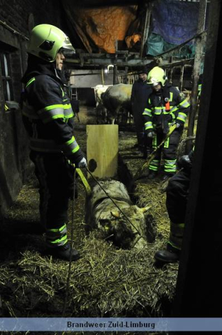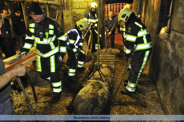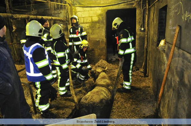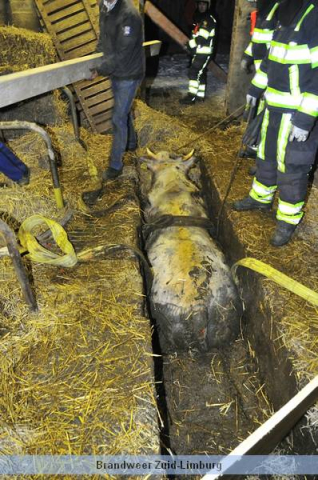 Op donderdag werd uitgerukt voor een melding dat een stier vast zou zitten in een gierkelder aan het Klein – Haasdal in Schimmert. De eigenaars hadden in eerste instantie zelf geprobeerd het dier te bevrijden, echter zonder resultaat. Diverse pogingen om het dier te bevrijden mislukten. Uiteindelijk werden enkele dakplaten verwijderd waarna met de kraan van het hulpverleningsvoertuig het ruim 900 kilo wegende dier uit de gierput werd gehesen. Ongeveer 1 uur na de melding was de stier bevrijd, en kon het dier uitrusten van alle inspanningen die het had meegemaakt.