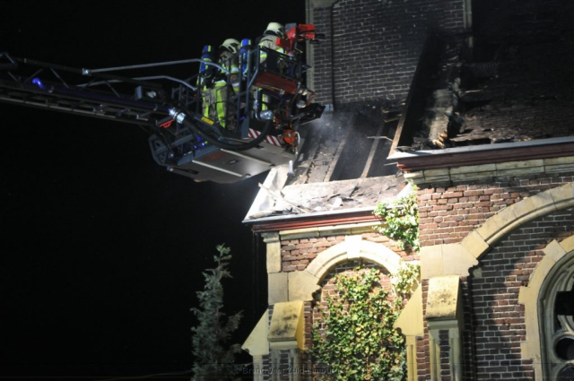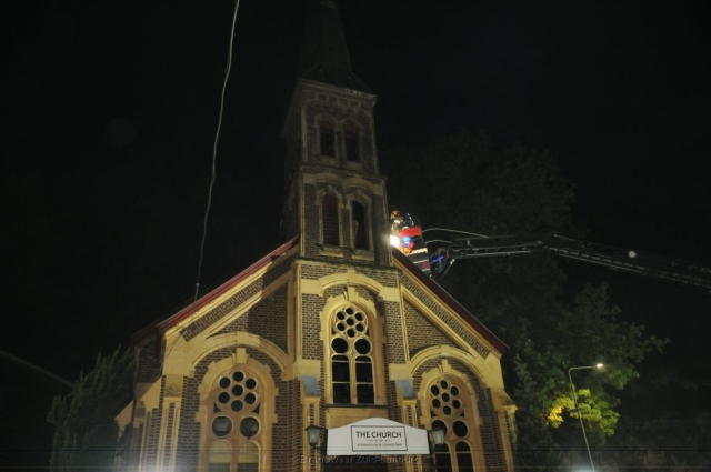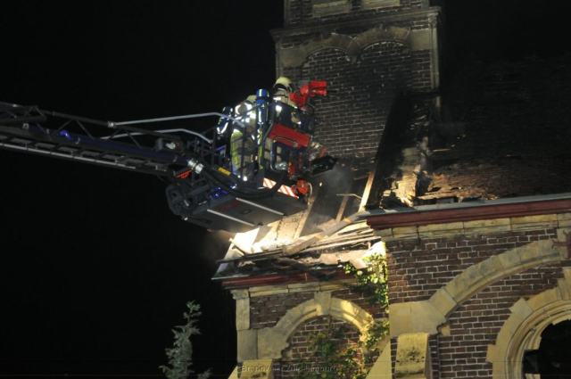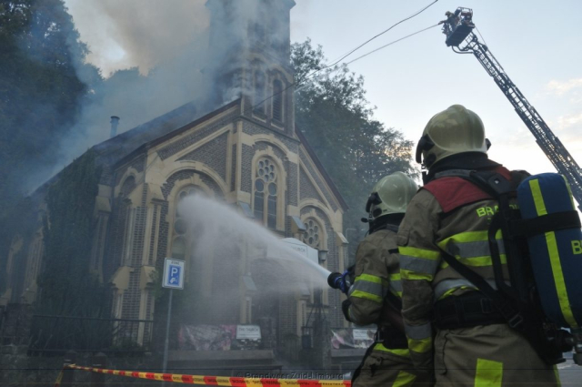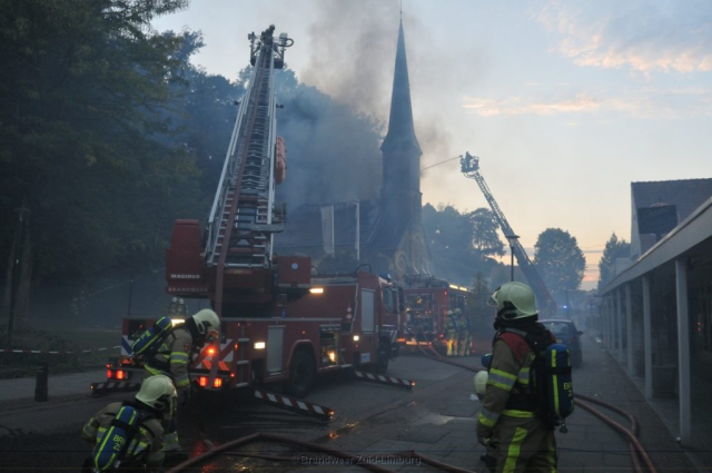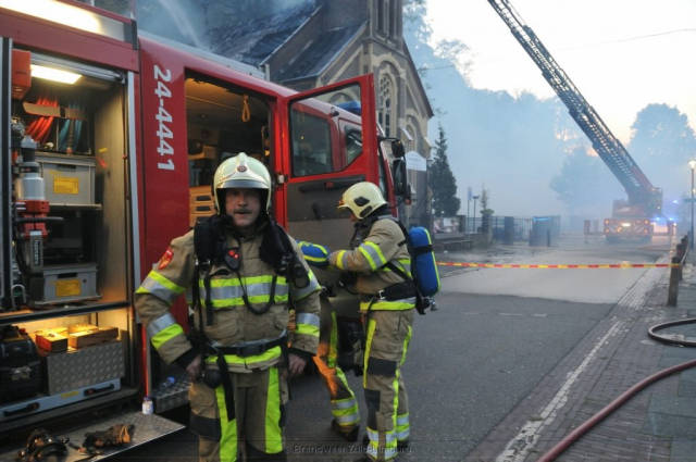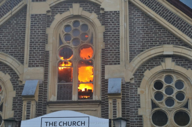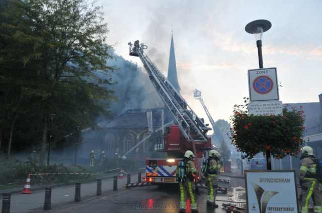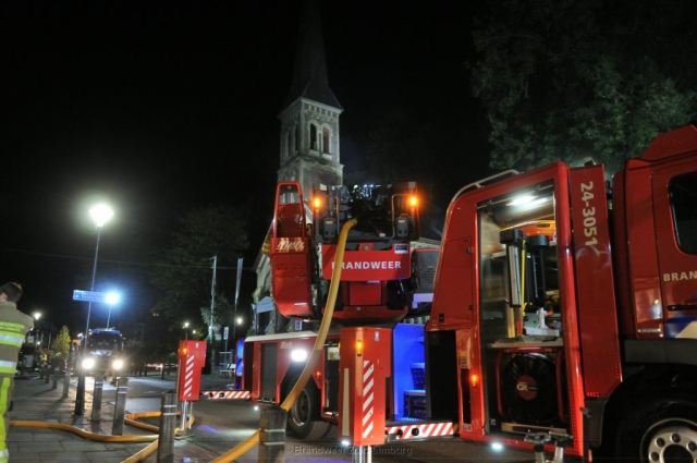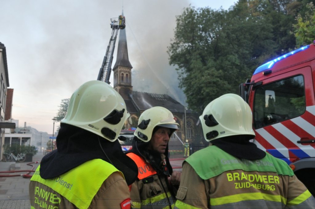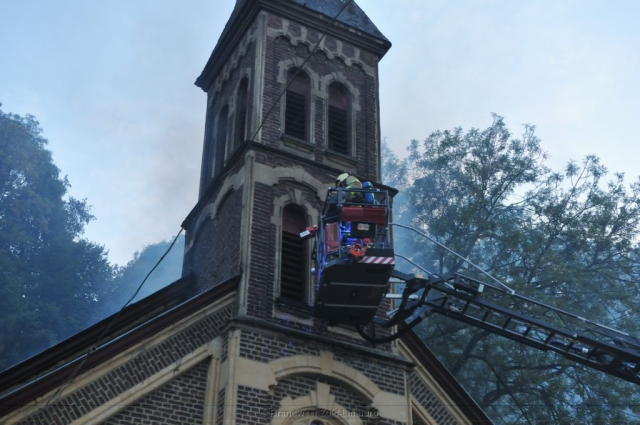 Na de eerste alarmering is de brand al snel opgeschaald naar grote brand en zijn ook twee autoladders ingezet om de dakbrand goed te kunnen bestrijden. Naast blussing is hierbij ingezet op het voorkomen van uitbreiding naar de torenspits om instorting te voorkomen. Dit is gelukt. Omdat de integriteit van de constructie van het gebouw is aangetast wordt het gebouw afgehekt. Vanwege de grote rookontwikkeling zijn meteen meetploegen in gezet om de concentratie gevaarlijke stoffen te meten. In eerste instantie is gemeten in de nabijgelegen hoge appartement complexen en in het uitgaansgebied. Op beide locaties is geen verhoogde concentraties gevaarlijke stoffen gemeten. Na verloop van tijd is door het blussen en de geringe windsnelheid de rook neergeslagen op straatniveau. In de directe omgeving zijn ook meteen binnen metingen verricht. Ook daar werden geen verhoogde concentraties gevaarlijke stoffen gemeten.
