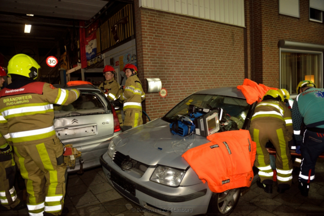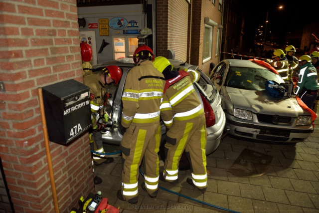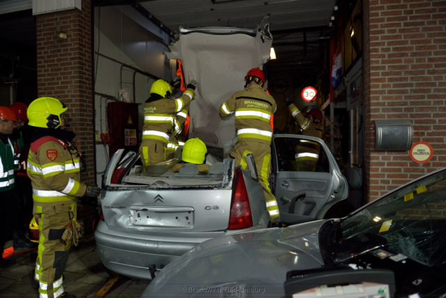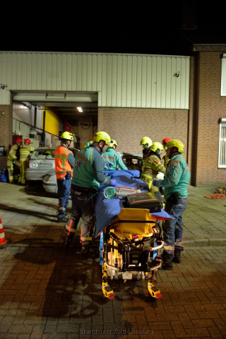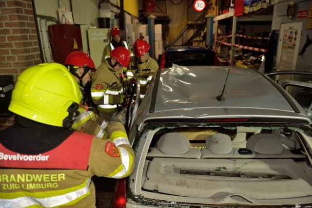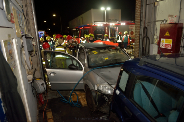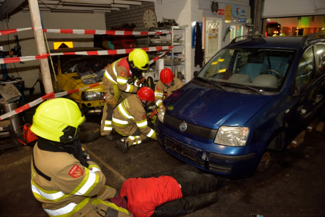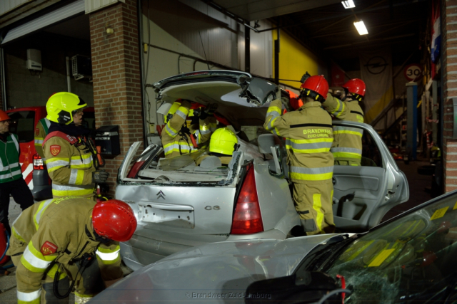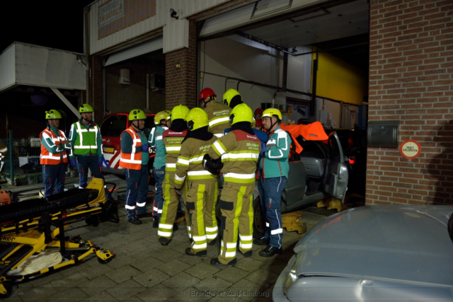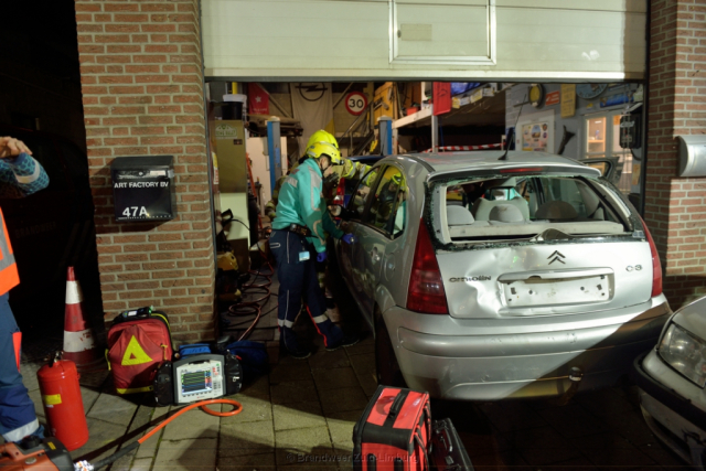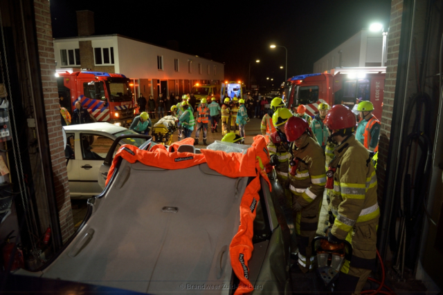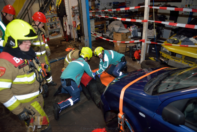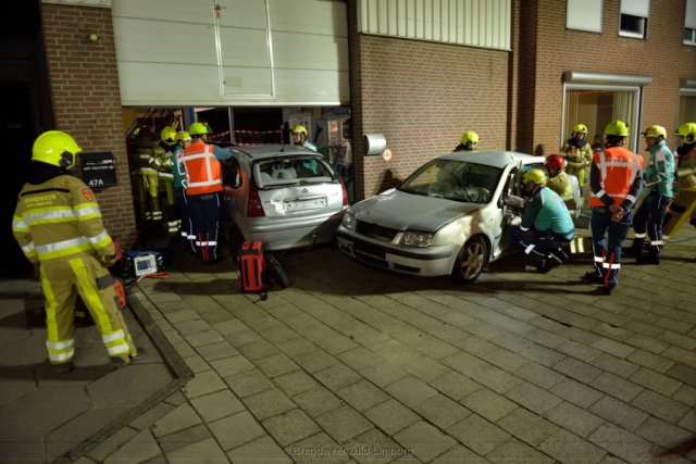 Bij aankomst bleek er sprake van een fikse aanrijding, waarbij een personenauto tegen een ander voertuig was gebotst. Dit voertuig schoof vervolgens een werkplaats van een garagebedrijf binnen, en raakte daarbij een voertuig dat in onderhoud was bij het garagebedrijf. De medewerker kwam hierbij vast te zitten onder het voertuig. In totaal raakten 3 personen bekneld. De brandweer is samen met de ambulancedienst een uur bezig geweest om alle slachtoffers uit hun benarde positie te bevrijden.